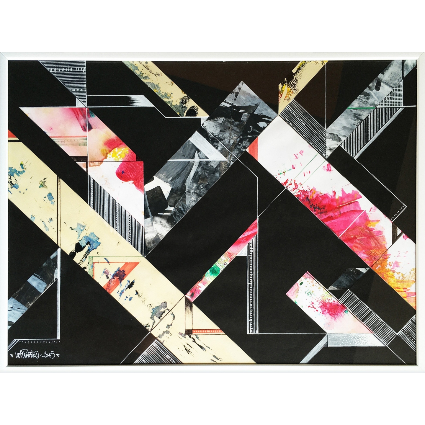 Black and white, colors, straight lines, angles, corners, dots, text…. a mixture of techniques, emotions, images, desires. You can perfectly feel what the artist, accustomed to rectilinear and angular creations, wanted to convey as a message.