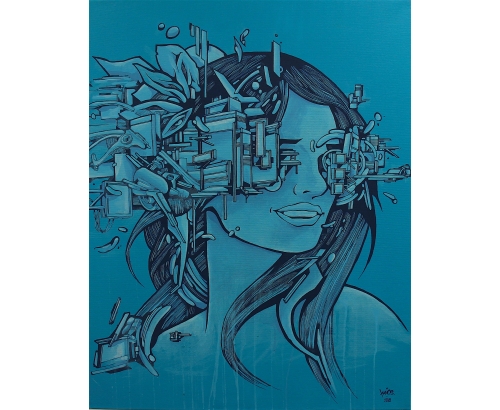 Je cache volontairement le regard de mes personnages et le remplace par des éléments qui évoquent leur imaginaire. Le vivant, les buildings, les machines & le végétal s’y mélangent pour former un univers transhumain.