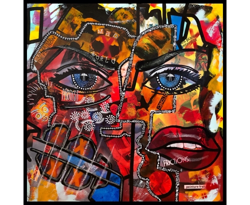 FRICTIONS, c’est une toile qui peut paraître simple, avec un visage, un regard qui nous fixe….mais approchez-vous un peu et vous pourrez déceler les différentes histoires que l’artiste a voulu vous faire partager. Les mots et les collages ont un sens, à vous de le découvrir.