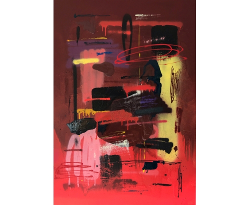 Cette toile représente encore la fusion des différents univers artistiques chers à l’artiste. Textures aux couleurs chaudes se mélangent pour donner vie à une création contemporaine graffiti.